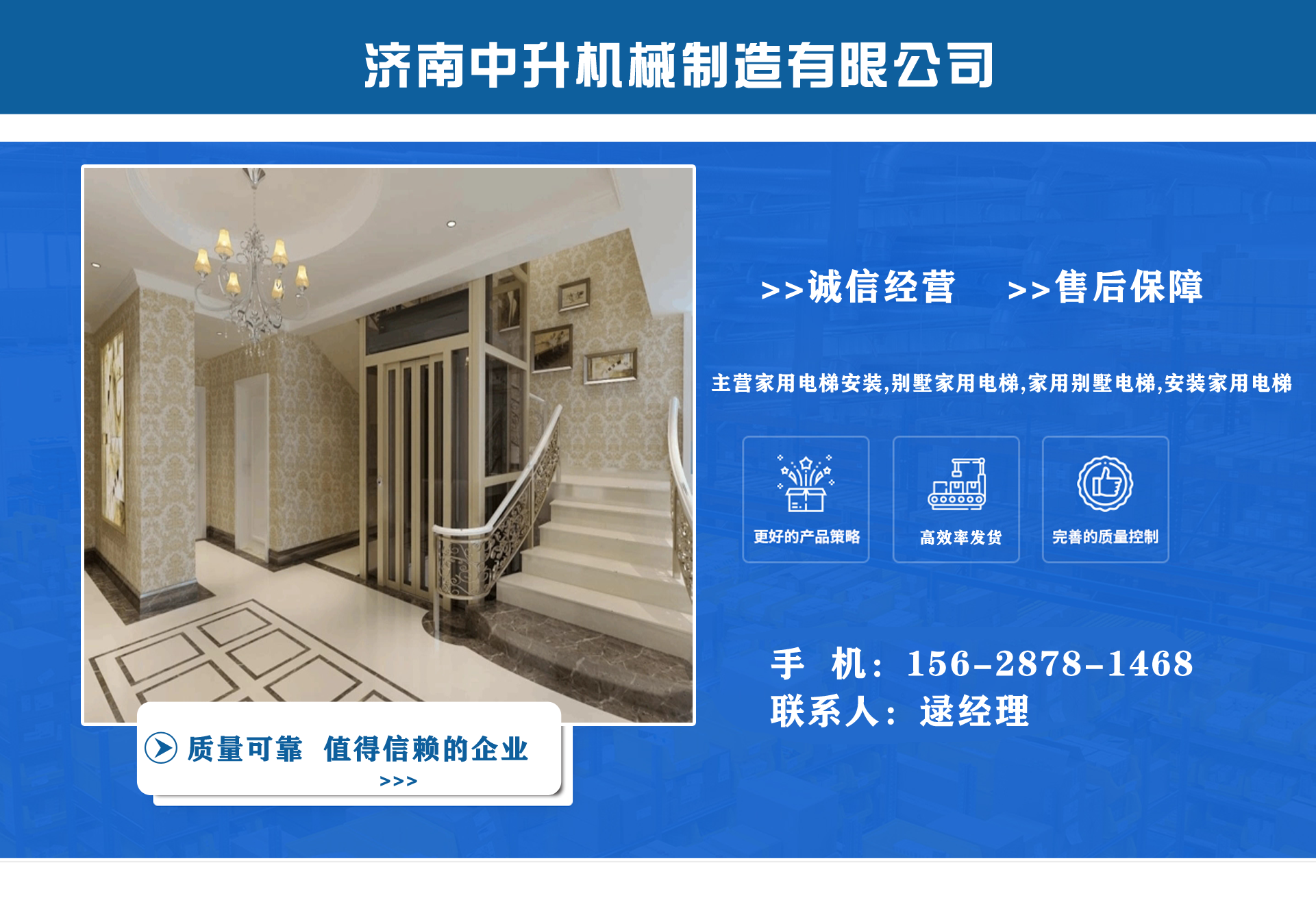 濟南中升機械制造有限公司主營家用電梯安裝,別墅家用電梯,家用別墅電梯,安裝家用電梯等業(yè)務,質量可靠,值得信賴! 公司為客戶提供免費上門測量,根據實際情況1對1服務,保障符合用戶需求,終身提供售后服務,讓用戶買的舒心用的放心。匠心團隊,打造信賴產品,我們有團結、奮進拼搏的匠心團隊,為您提供可信賴的品質保證。 從創(chuàng)立以來一直嚴格執(zhí)行質量管理體系、環(huán)境管理體系等相關標準管理體系,“顧客滿意”是我們始終如一的追求。我們有屬于自己培養(yǎng)的安裝隊伍,24小時服務電話,為您提供可靠的服務與支持。 我們的愿景是建設國內具有影響力的電梯公司,做城市美好空間的好伙伴。...